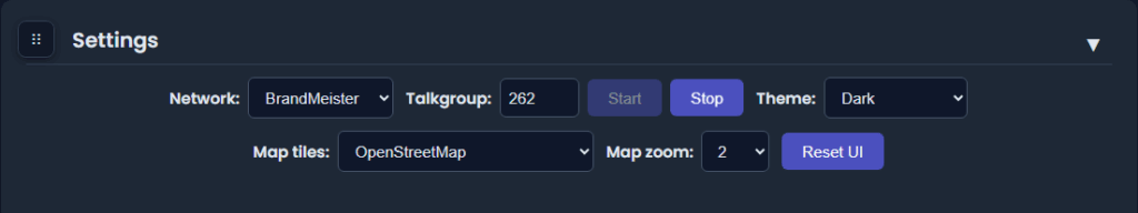 Im oberen Bereich findet ihr die Settings, also die Einstellungen, mit denen ihr festlegen könnt, welches Netz ihr beobachten wollt, welche Talkgroup und welche Karte ihr benutzen möchtet. Außerdem könnt ihr dort das Erscheinungsbild der Seite anpassen – zum Beispiel zwischen dunklem und hellem Modus wählen oder eine Farbkombination im Stil bekannter Seiten wie Pi-Star, WPSD oder BrandMeister verwenden.