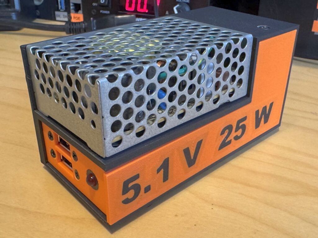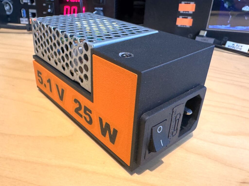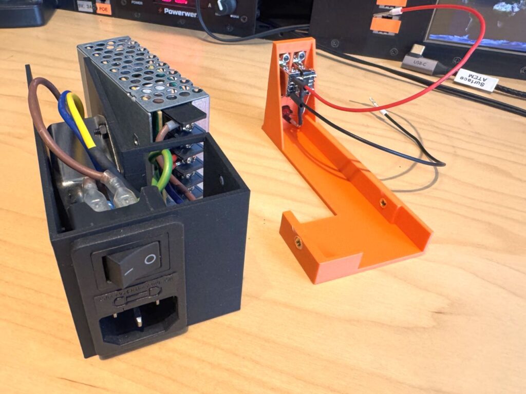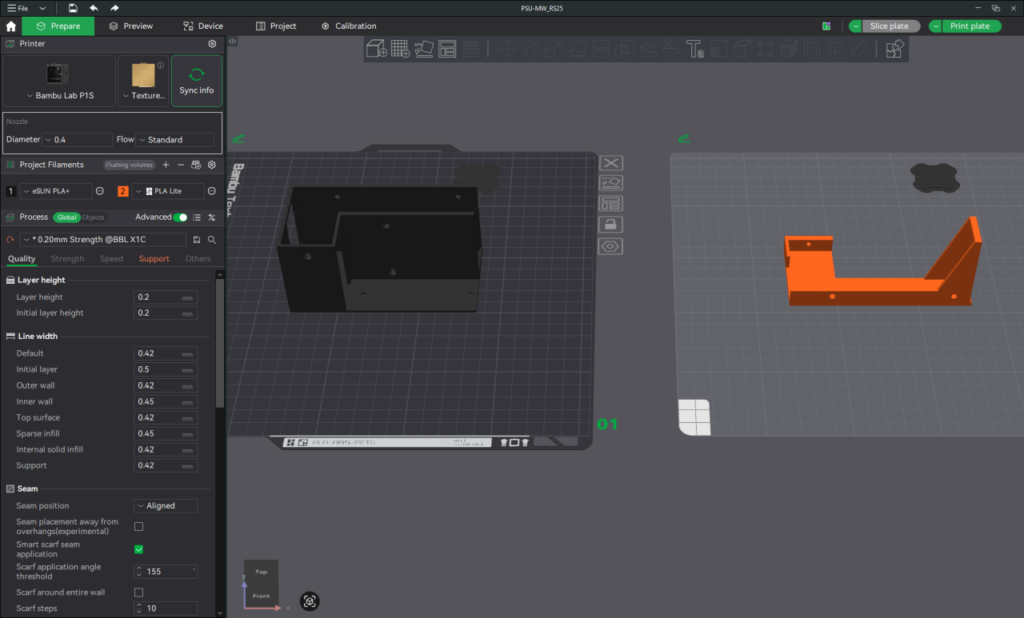 Im Slicer habe ich zusätzlich Beschriftungen direkt in die Druckteile integriert. Da das Netzteil ausschließlich im Innenbereich eingesetzt wird, fiel die Materialwahl auf PLA. Das Gehäuseunterteil wurde in Matt-Schwarz mit orangener Beschriftung gedruckt, das Oberteil in Orange mit matt-schwarzer Beschriftung.