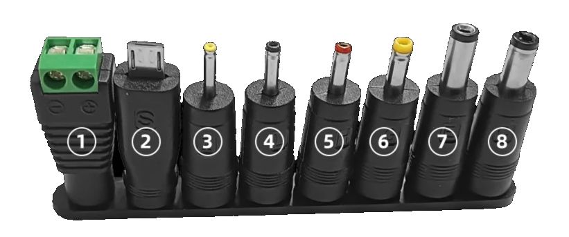 Je nach Angebot kann man zwischen verschiedenen Varianten wählen: nur das Kabel mit DC-Hohlstecker oder das Kabel mit zusätzlichen Adaptersteckern.