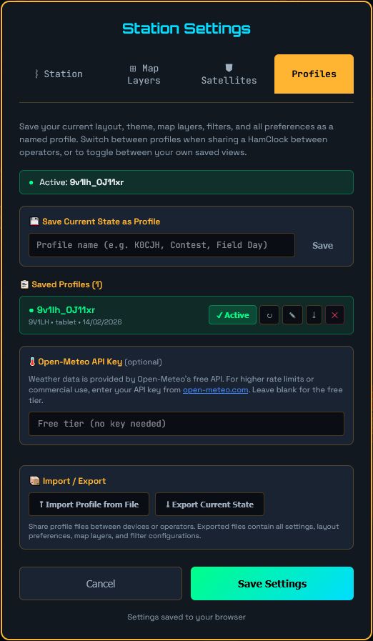 Im Bereich „Profiles“ lassen sich unterschiedliche Konfigurationsprofile anlegen. Das ist besonders praktisch, wenn ihr die OpenHamClock beispielsweise im Contest-Betrieb nutzt und dafür nur bestimmte Bänder beobachten oder nicht benötigte Module ausblenden möchtet. Anschließend könnt ihr jederzeit wieder zu eurem Standardprofil zurückkehren.
