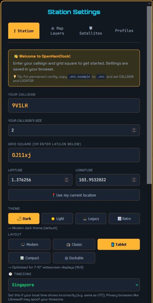 Ich betreibe meine OpenHamClock im Dark-Theme und im Tablet-Modus. Auch wenn ich aktuell nicht auf Kurzwelle aktiv bin, nutze ich sie gern als kompaktes Informations-Dashboard.