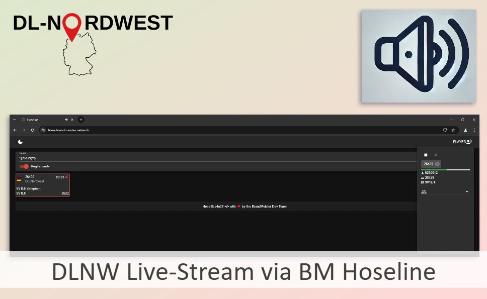 In unserem Beitrag „DLNW Live-Stream via BM Hoseline“ hatten wir euch bereits eine Möglichkeit aufgezeigt, wie ihr den Funkverkehr auf DL-Nordwest ganz einfach über den Browser mithören könnt. Musstet ihr dafür bisher noch die externe Webseite BrandMeister Hoseline aufrufen und den Funkverkehr auf die TG26429 beschränken, bieten wir euch jetzt eine direkte Lösung auf unserer eigenen Webseite dl-nordwest.com.