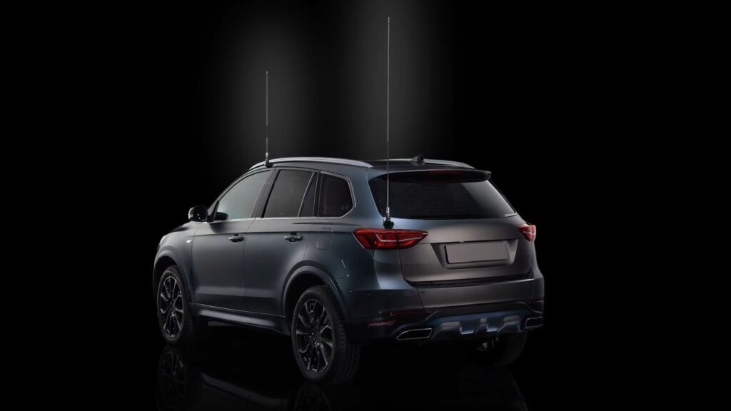 Die gezeigte Fahrzeugszene liefert weitere Hinweise: Eine kurze Antenne nahe der Fahrerseite deutet auf den Betrieb im 2 m- und 70 cm-Band (UKW) hin, während eine deutlich längere Antenne an der Heckklappe typisch für Kurzwelle bzw. 50 MHz ist. Das spricht klar für einen Allband-/Allmode-Mobiltransceiver von HF bis UHF.